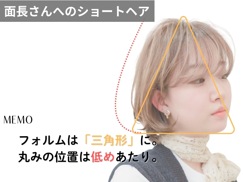 そこでおすすめなのが、丸みの位置を少し下げた、三角形に近いフォルムの少し長めショート です。